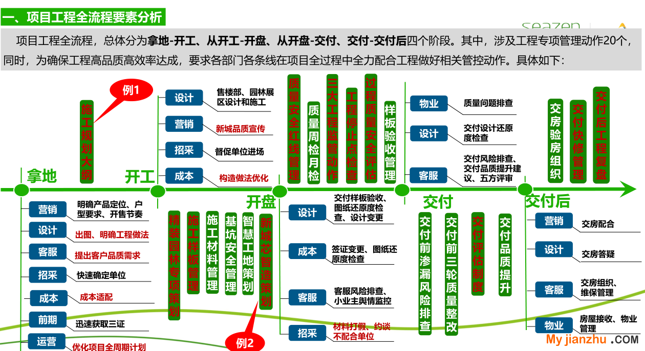 本课件详细介绍了项目工程全流程的工程管理要点,从拿地-开工、从开工-开盘、从开盘-交付、交付-交付后四个阶段,各部门的管理要点
