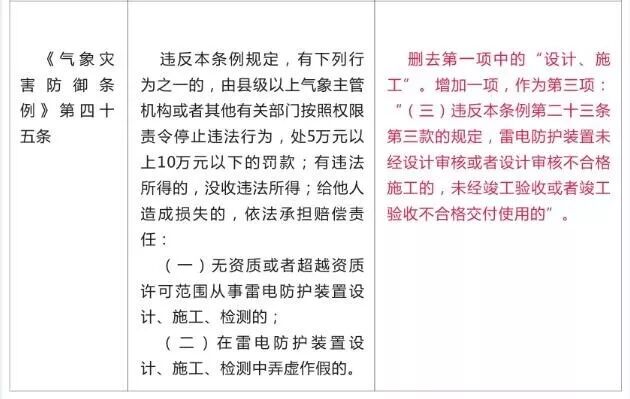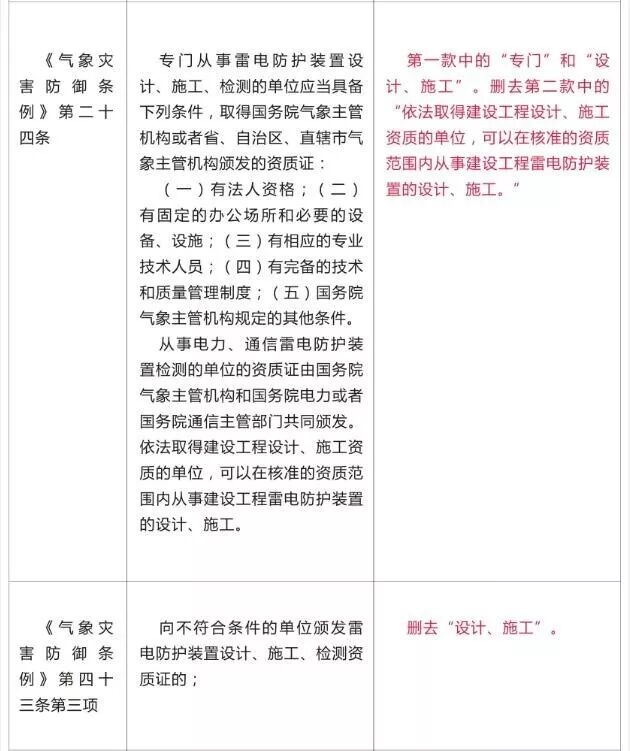 删去第二十四条第一款中的“专门”和“设计、施工”。删去第二款中的“依法取得建设工程设计、施工资质的单位,可以在核准的资质范围内从事建设工程雷电防护装置的设计、施工。”