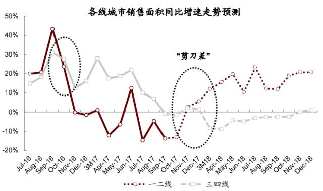 从各线城市的销售面积同比增速走势来看,预计一二线与三四线城市销售面积同比增速将在今年11月和12月出现反转,恰与去年四季度市场走势(三四线销售增速反超一二线)相逆转。