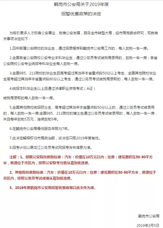 3月5日,黑龙江鹤岗市公安局网站发布的《鹤岗市公安局关于2019年度招警优惠政策》提到,多类符合条件的公安院校毕业生可以享受到“一车一房”优惠。