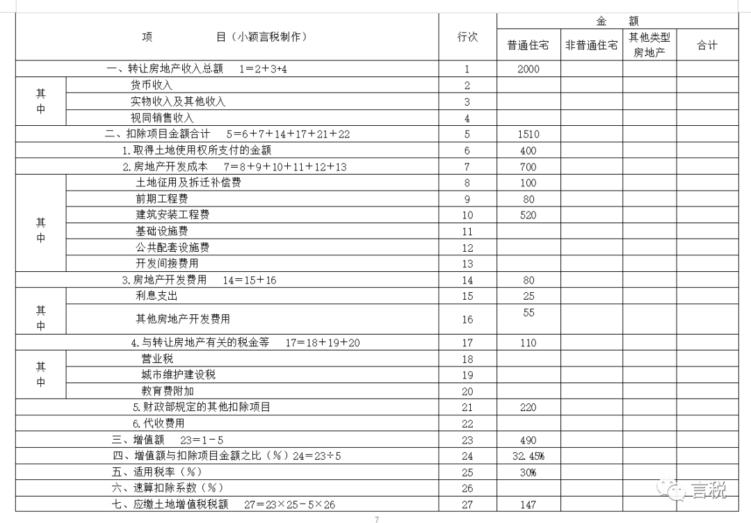 应该缴纳土地增值税税额=490*30%=147(万元)