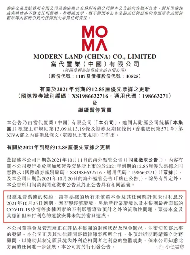 本次于10月25日到期的美元债违约之前,当代置业就已经在10月11日公告寻求展期至2022年1月25日,同时,该公司还在寻求缩短债券选择性赎回的通知期,并赎回8750万美元的债券本金。