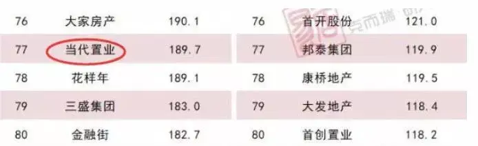 据克而瑞数据,今年上半年当代置业以189.7亿操盘金额位居房企第77位;以183.1万平方米操盘面积排第50名,属于百强中小房企。