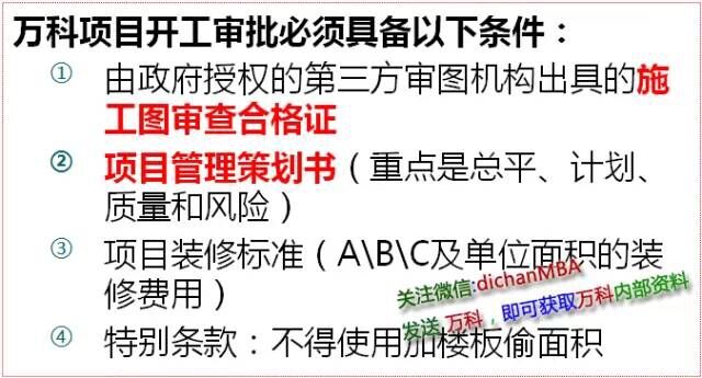 万科项目必须全部履行开工审批手续,无审批手续不得开工,违规开工者从公司第一负责人到项目经理均在全集团进行通报批评并纳入绩效考核,最终影响个人的年终绩效和奖金。