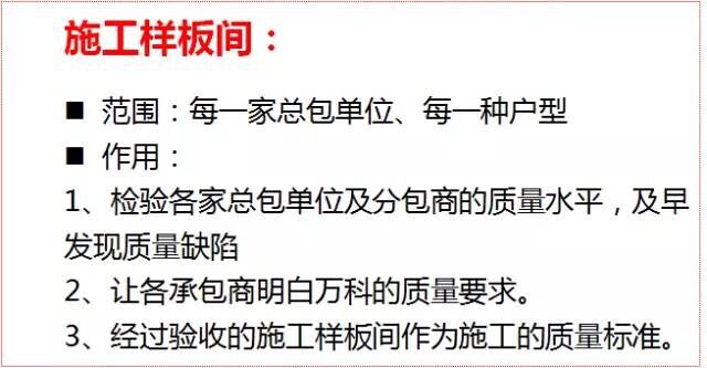 要求:样板的施工工艺和质量合格后,才能大面积施工。